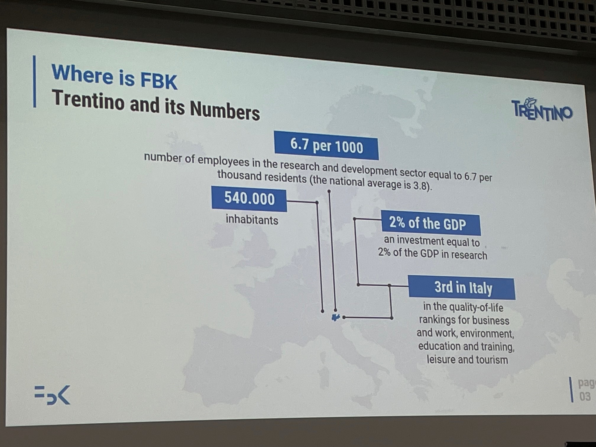 Tom se prilikom obišla Zaklada Bruno Kessler (FBK), vrhunski istraživački institut u Italiji. Prema najnovijoj kvaliteti istraživanja isti je zauzeo je 1. mjesto za znanstvenu izvrsnost u tri različita predmetna područja uključujući ekonomski i društveni učinak. Sa svojih 3.500 četvornih metara laboratorija i znanstvene infrastrukture i zajednicom od preko 400 istraživača, 140 doktoranada, 200 gostujućih suradnika i studenata, 700 podružnica i akreditiranih studenata, FBK djeluje kao znanstveno i tehnološko središte, ugošćujući živahan ekosustav zajedničkih pothvata, spin-offova, projekata i prilika za obuku. Ondje nam je predstavljan SENSAT model https://magazine.fbk.eu/en/news/sensat-the-school-to-work-program-on-display/, primjer suradnje ove istraživačke organizacije, brojnih srednjih škola i realnog sektora. Učenici različitih škola tako tijekom cijele školske godine surađuju s istraživačima FBK-a na izradi različitih proizvoda predstavaljući implementaciju stvarnog modela kombinacije škola-rad. Naime, model je strukturiran tako da simulira tvrtku koja se sastoji od specijaliziranih odjela, od kojih svaka srednja škola ima područje koje treba istražiti, a obrađuju se svi elementi koji karakteriziraju inovacijski lanac, uključujući pravne aspekte, analizu tržišta, izradu poslovnog plana, procjenu utjecaja koji bi proizvod imao na lokalno područje i okoliš, te sam razvoj i dizajn tehnologije. Stvaraju se multidisciplinarni radni timovi i svaka se škola brine za jedno područje razvoja, na temelju svojih specifičnih vještina, a djeca imaju priliku razumjeti kako istraživanja mogu imati stvarni utjecaj na tržište i lokalno područje.